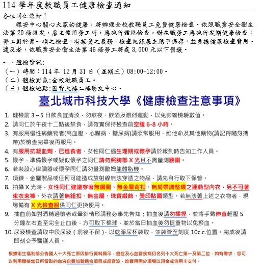 114學年度教職員工健康檢查通知